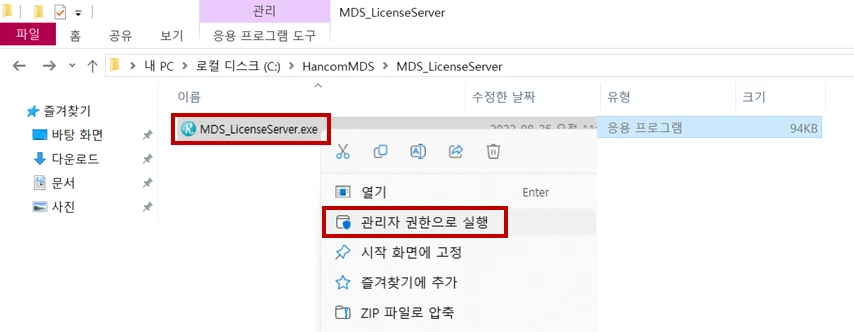 MDS_LicenseServer.zip 파일을 압축 해제 후 “MDS_LicenseServer.exe” 파일을 관리자 권한으로 실행