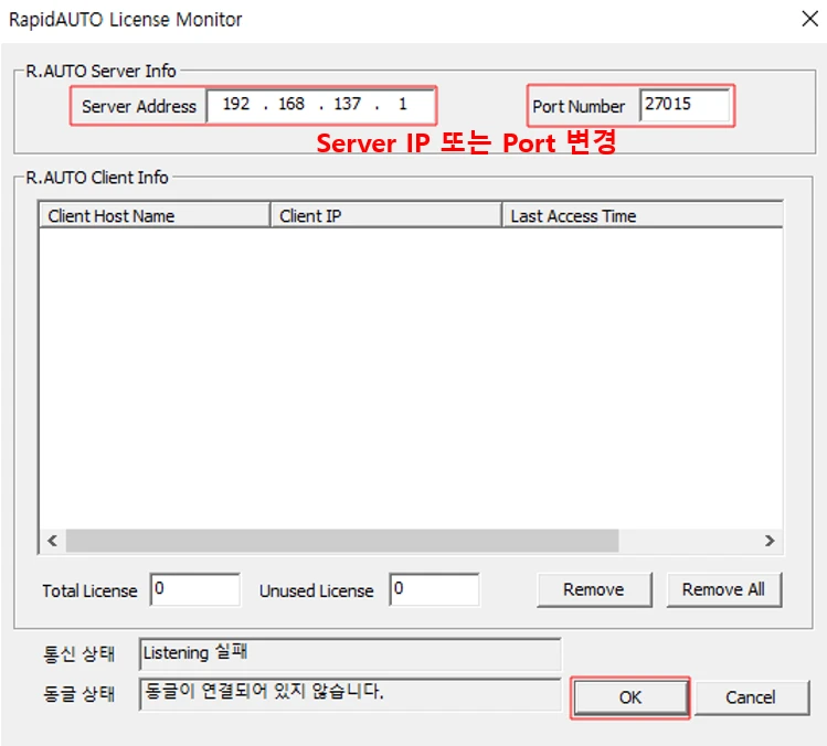 서버 PC의 IP Address 또는 Port Number 수정이 필요한 경우 수정하고자 하는 IP또는 Port Number 를 입력하고 ‘OK’ 버튼을 클릭하면 변경된 정보로 라이선스 서비스가 다시 시작 된다.