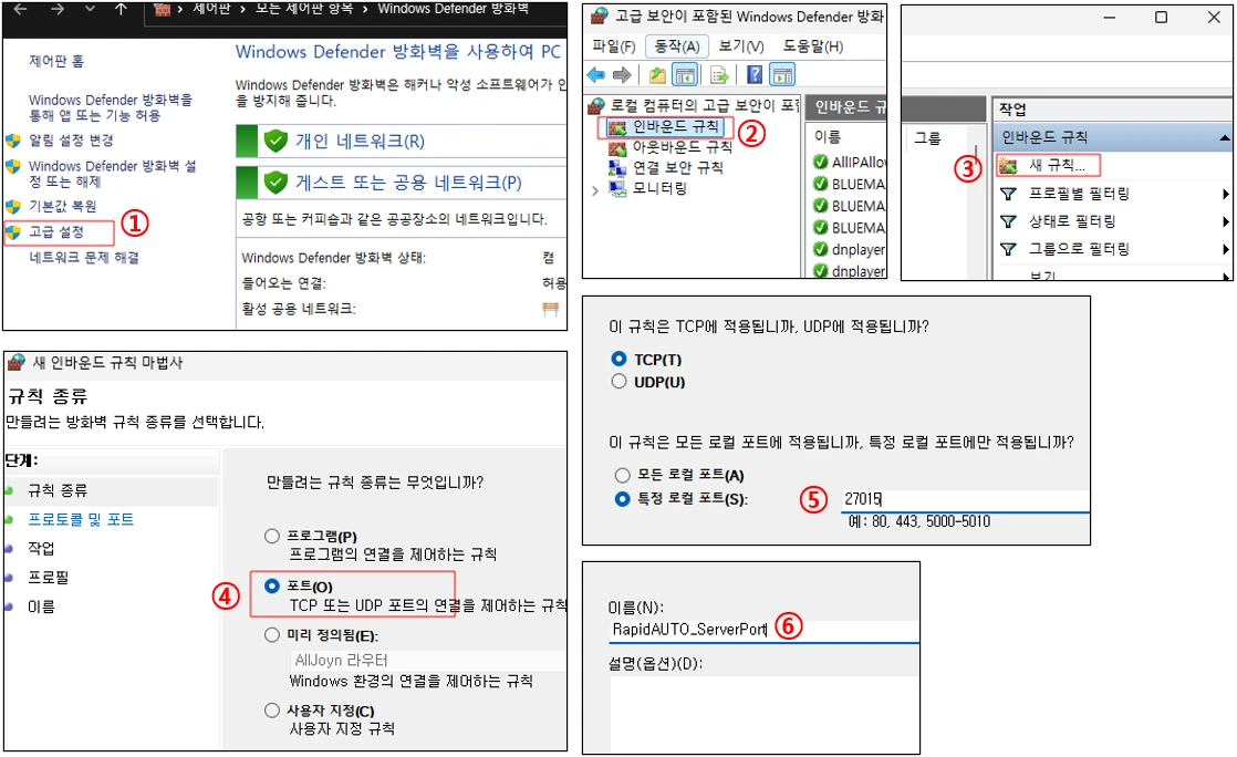 ⑤ TCP, 특정 로컬 포트 - RapidAUTO Server Port에 지정한 Port 입력