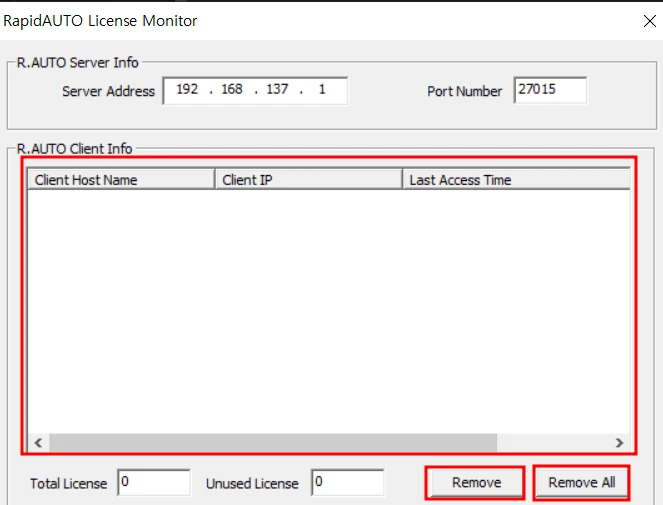 Client 접속 시 “R.AUTO Client Info”에 접속 명단 출력 (Client에서 30분 이상 미 접속 시 Server에서 강제로 라이선스 회수)