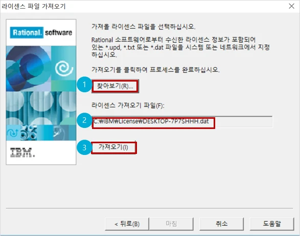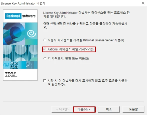 - License Key Administrator 실행 시 아래와 같은 화면이 보이면 “Rational 라이센스 파일 가져오기” 선택 후 다음 버튼을 클릭한다.