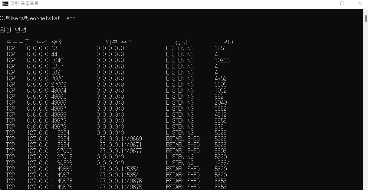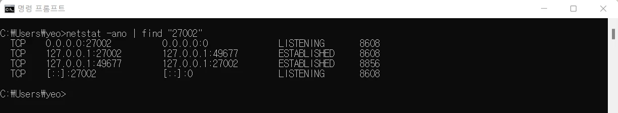 예) netstat -and | find “27002”포트가 사용중일 경우 아래와 같이 정보가 나온다