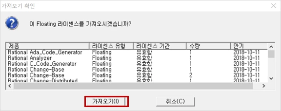 구매한 제품을 구성하는 세부 라이센스 기간, 수량, 만기일을 확인 후 가져오기를 클릭한다.
