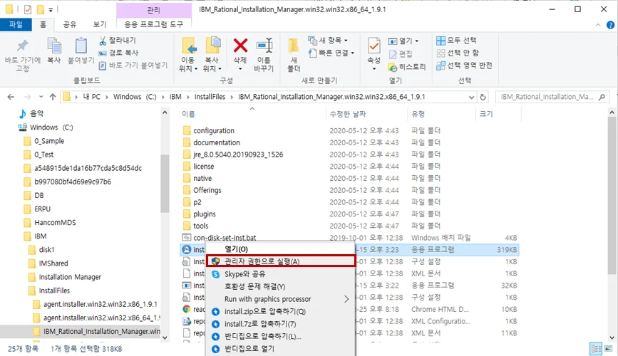 IBM_Rational_Installation_Manager.win32.win32.x86_64_1.9.1 폴더에 install.exe 파일을 실행 한다.(관리자 권한으로 실행 권장)