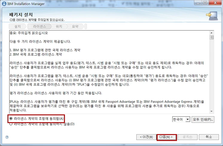 - 하단의 라이선스 계약의 조항에 동의함 버튼을 클릭하고 다음 버튼 클릭