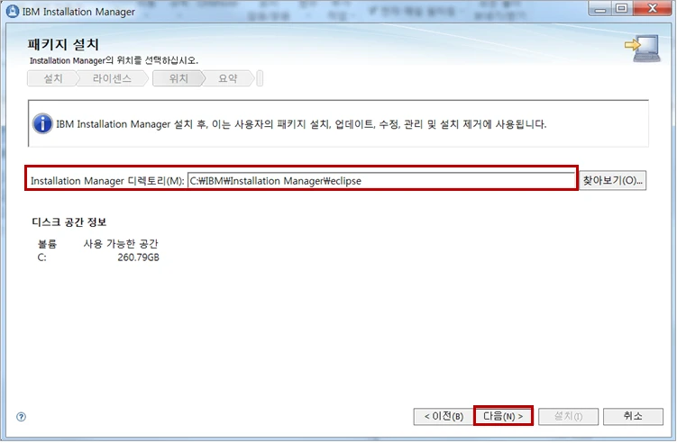 설치 디렉토리 경로 중 “Program Files”를 삭제하고 C:\IBM~로 설치 디렉토리를 지정한다.