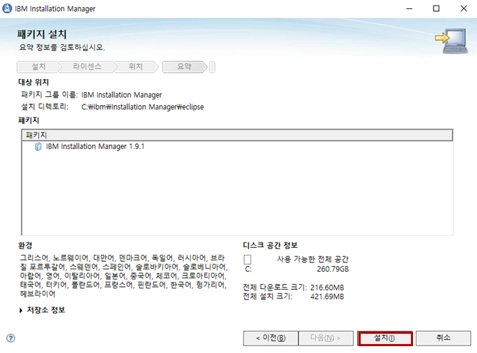 - 앞에서 설정한 내용이 맞게 반영 되었는지 확인한 후 설치 버튼을 클릭한다.