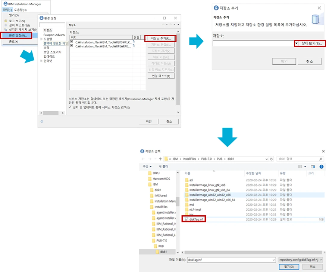파일 > 환경설정 > “저장소 추가” 를 클릭하고 설치 파일(PUB 7.0) 경로의 “diskTag.inf” 파일을 설정한다.