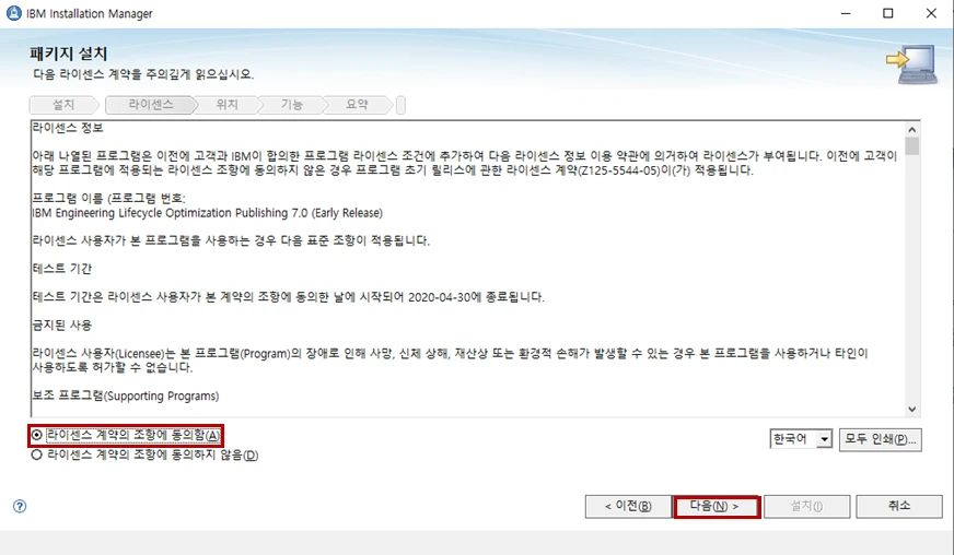 하단의 라이선스 계약의 조항에 동의함 버튼을 클릭하고 다음 버튼을 클릭한다.
