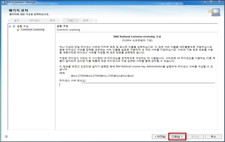 라이선스 서버 경로는 추후에 지정할 예정이므로 라이선스 서버 요소를 공란으로 비워 둔 후 다음 버튼을 클릭한다.