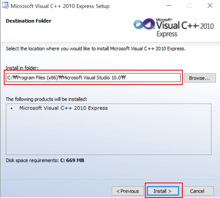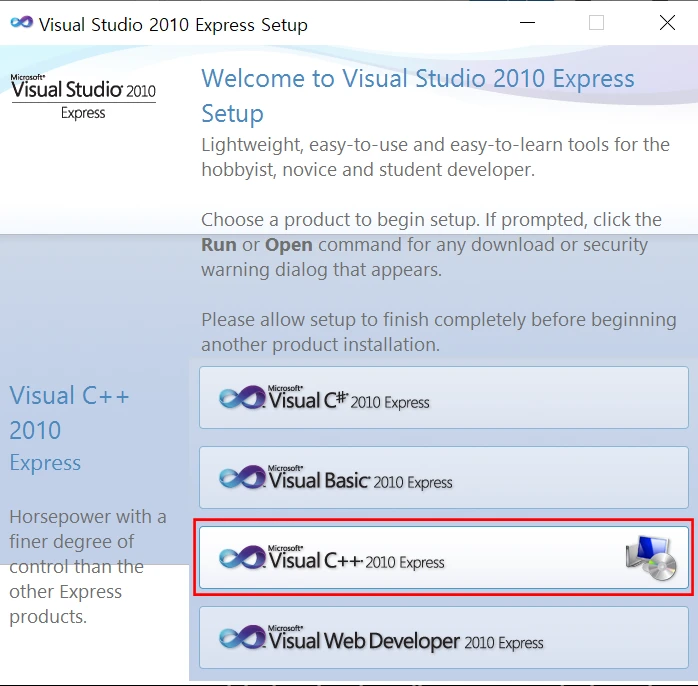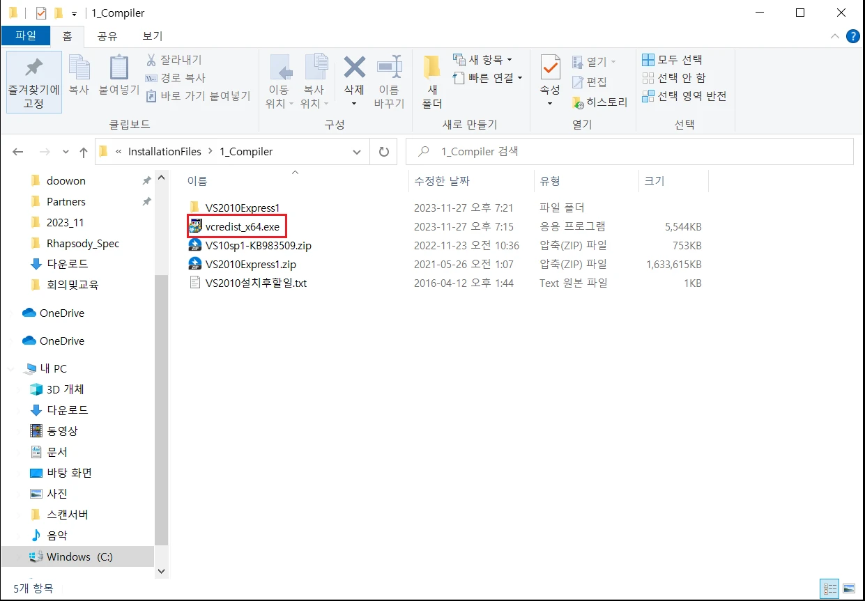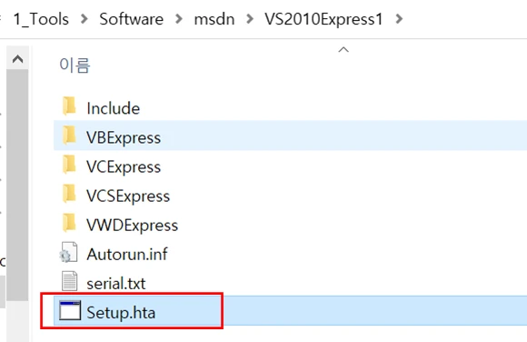 Visual Studio 재배포 패키지 다운로드다운 받은 파일을 실행시킨 후, VS2010Express1 폴더에 있는 Setup.hta 파일을 다시 실행하면 Compiler가 정상적으로 설치된다.