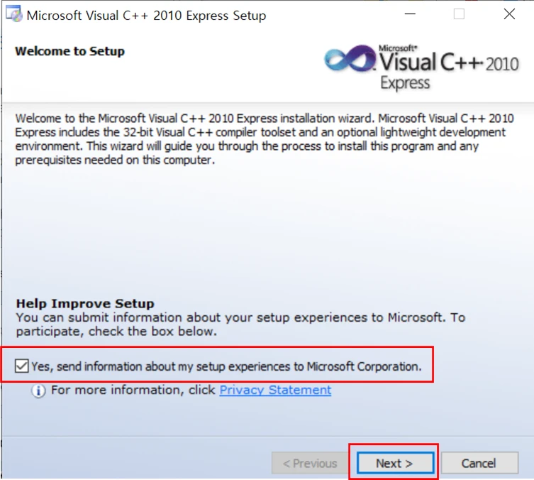 Visual Studio 컴파일러 설치 도중 위와 같은 오류가 발생하는 원인은 PC에 Visual Studio 2010 재배포 가능 패키지가 설치가 되어 있지 않기 때문이다. 아래 가이드를 참고하여 Visual Studio 공식 홈페이지에서 재배포 패키지를 다운 받아 설치하고 Visual Studio 컴파일러를 설치한다.