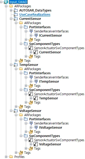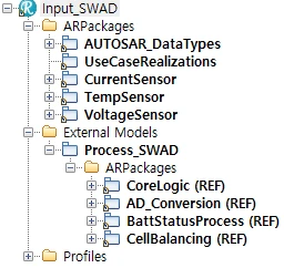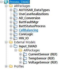 AUTOSAR 아키텍처 모델의 구성은 System_SWAD 모델 하위에 Subsystem_SWAD 모델로 구성된다.