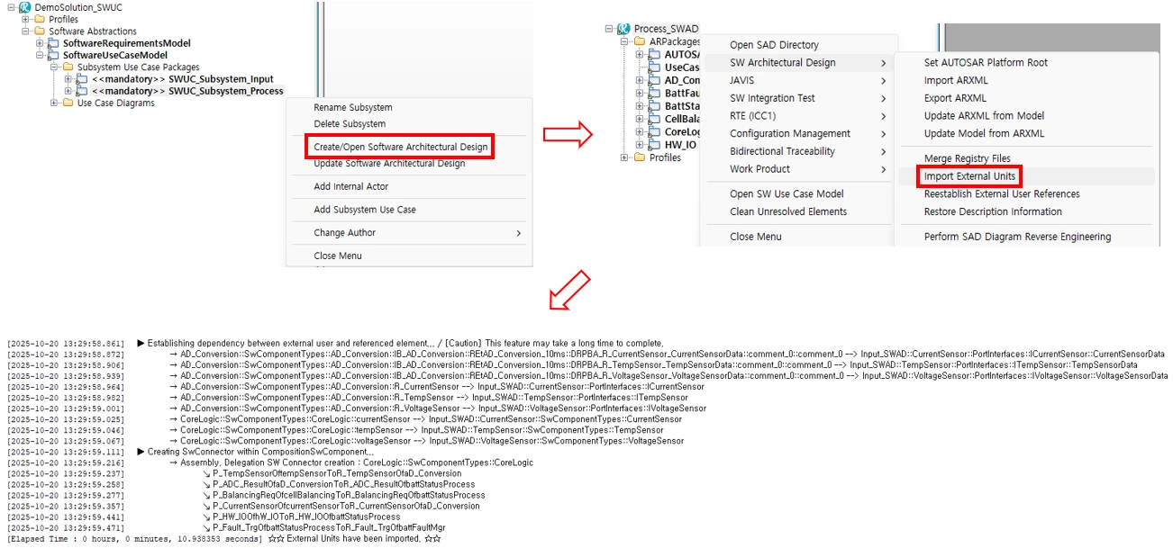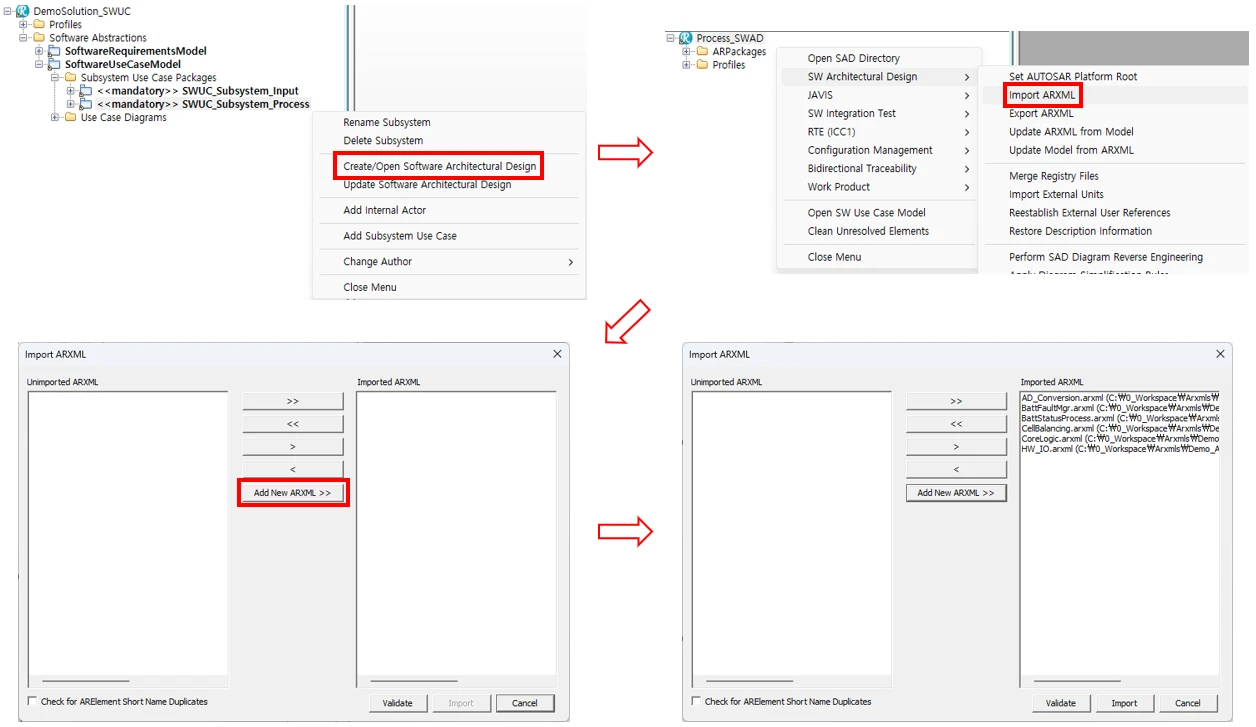 Context Menu에서 SW Architectural Design > Import ARXML 기능 실행
