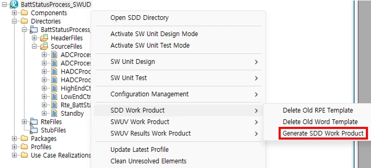 Context Menu에서 SDD Work Product > Generate SDD Work Product 선택